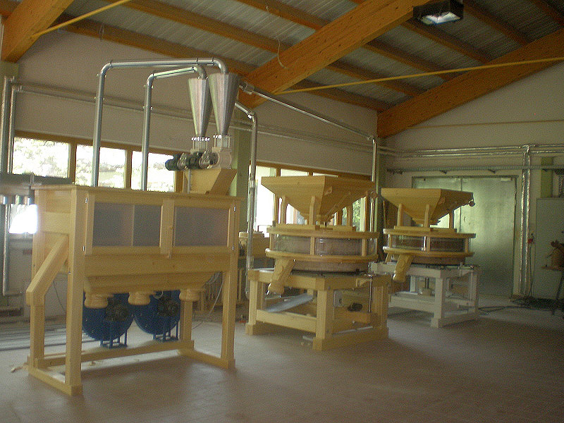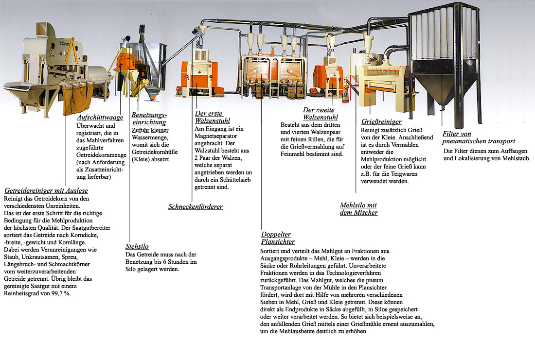 Mit dieser Getreidemühlen-Anlage können verschiedene Sorten Mehl und Grieß produziert werden. Das in der Getreidemühle vermahlene Getreide wird mittels der pneumatischen Transportanlage in die Mehlsiebmaschine befördert. Dort wird in den einzelnen Kammern Mehl und Grieß in einem Arbeitsgang voneinander getrennt und gleichzeitig die Kleie extra aussortiert.